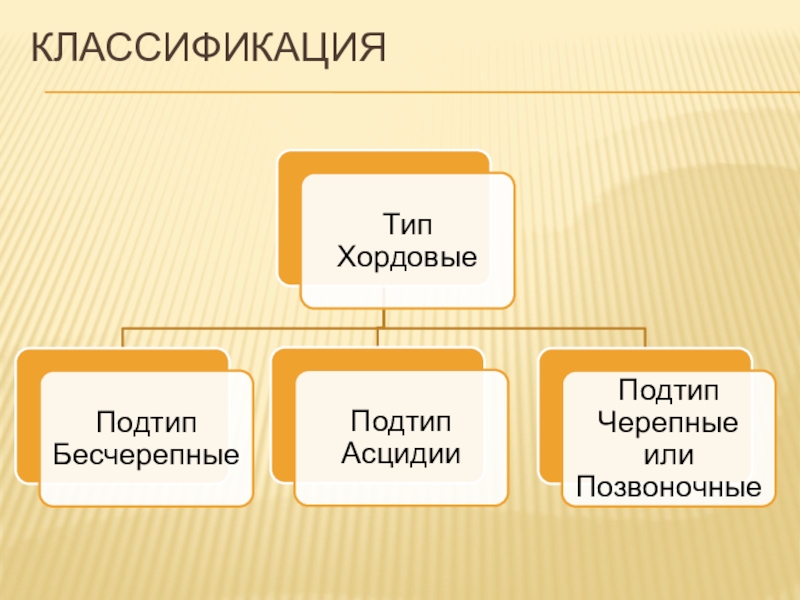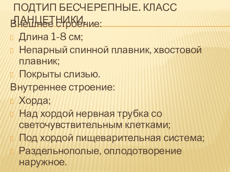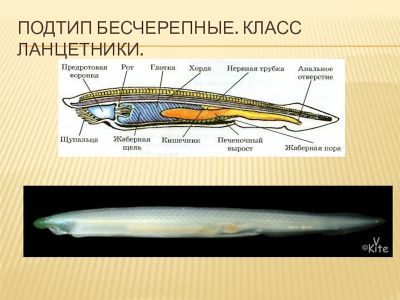 Подтип Бесчерепные. Класс ланцетники.Внешнее строение:Длина 1-8 см;Непарный спинной плавник, хвостовой плавник;Покрыты слизью.Внутреннее строение:Хорда;Над хордой нервная трубка со