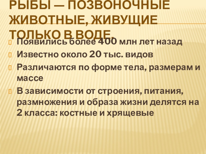 Рыбы — позвоночные животные, живущие только в воде.Появились более 400 млн лет назадИзвестно около 20 тыс. видовРазличаются
