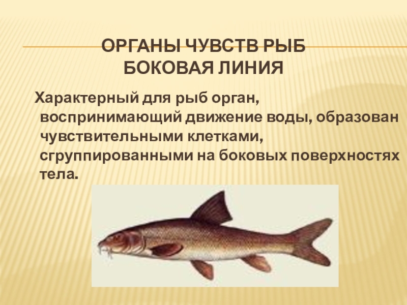 Органы чувств рыб Боковая линия  Характерный для рыб орган, воспринимающий движение воды, образован чувствительными клетками, сгруппированными