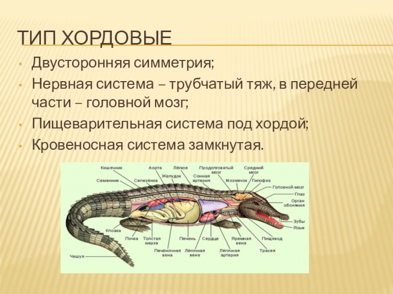 Тип хордовыеДвусторонняя симметрия;Нервная система – трубчатый тяж, в передней части – головной мозг;Пищеварительная система под хордой;Кровеносная система