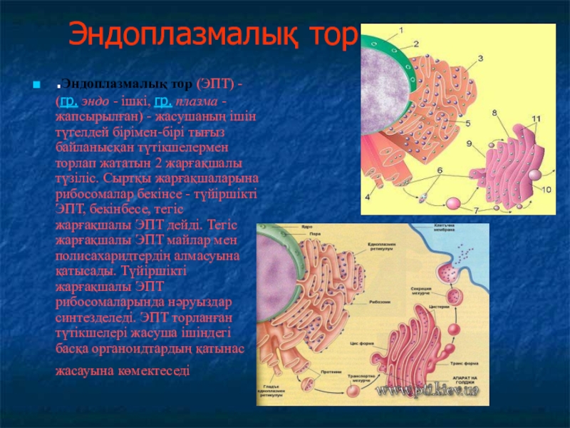 Эндоплазмалық тор.Эндоплазмалық тор (ЭПТ) - (гр. эндо - ішкі, гр. плазма - жапсырылған) - жасушаның ішін түгелдей
