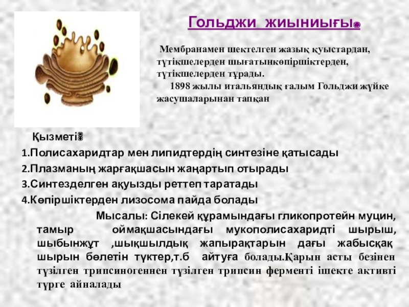 Цитоплазма органойдтары: эндоплазмалық тор,гольджи жиынтығы ,лизосомалар