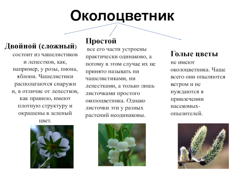 ОколоцветникДвойной (сложный) состоит из чашелистиков и лепестков, как, например, у розы, пиона, яблони. Чашелистики располагаются снаружи и,