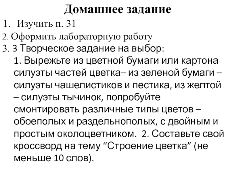 выбор: 1. Вырежьте из цветной бумаги или картона силуэты частей цветка– из зеленой бумаги – силуэты чашелистиков и пестика, из желтой – силуэты тычинок, попробуйте смонтировать различные типы цветов – обоеполых и раздельнополых, с двойным и простым околоцветником. 2. Составьте свой кроссворд на тему “Строение цветка” (не меньше 10 слов).