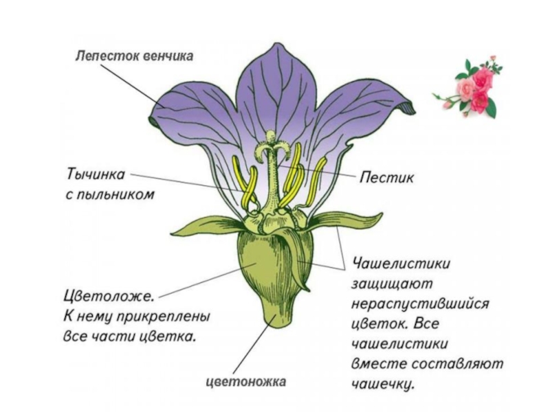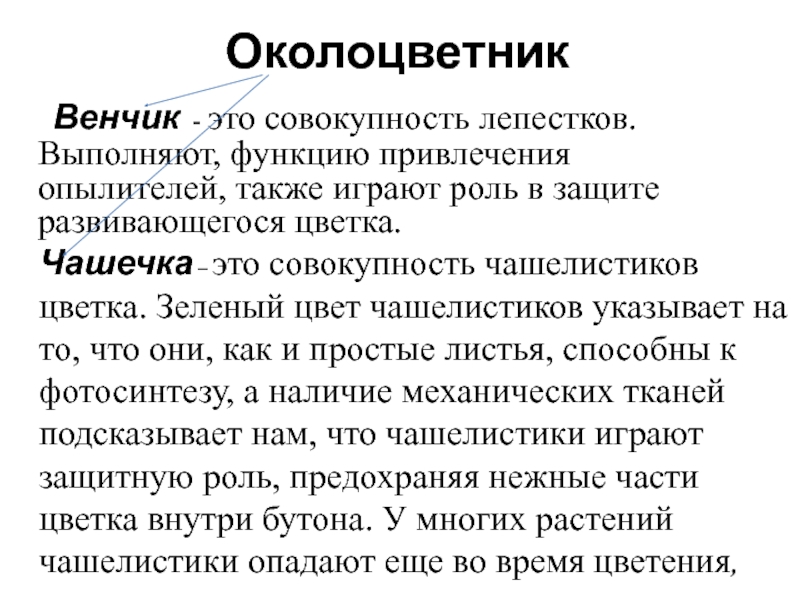 Чашечка – это совокупность чашелистиков цветка. Зеленый цвет чашелистиков указывает на то, что они, как и простые листья, способны к фотосинтезу, а наличие механических тканей подсказывает нам, что чашелистики играют защитную роль, предохраняя нежные части цветка внутри бутона. У многих растений чашелистики опадают еще во время цветения,