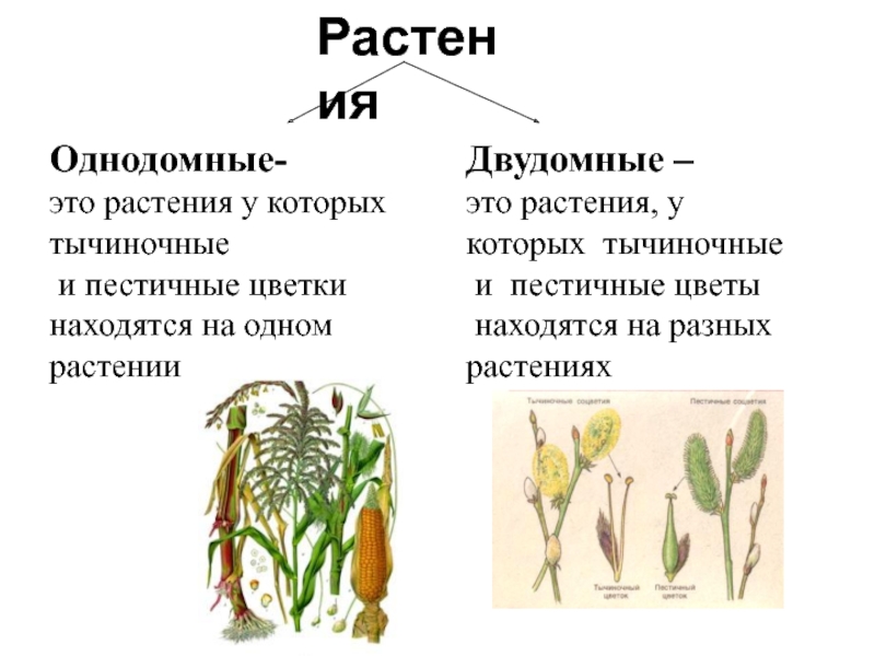 РастенияОднодомные-это растения у которых тычиночные и пестичные цветки находятся на одномрастенииДвудомные –это растения, укоторых тычиночные и пестичные