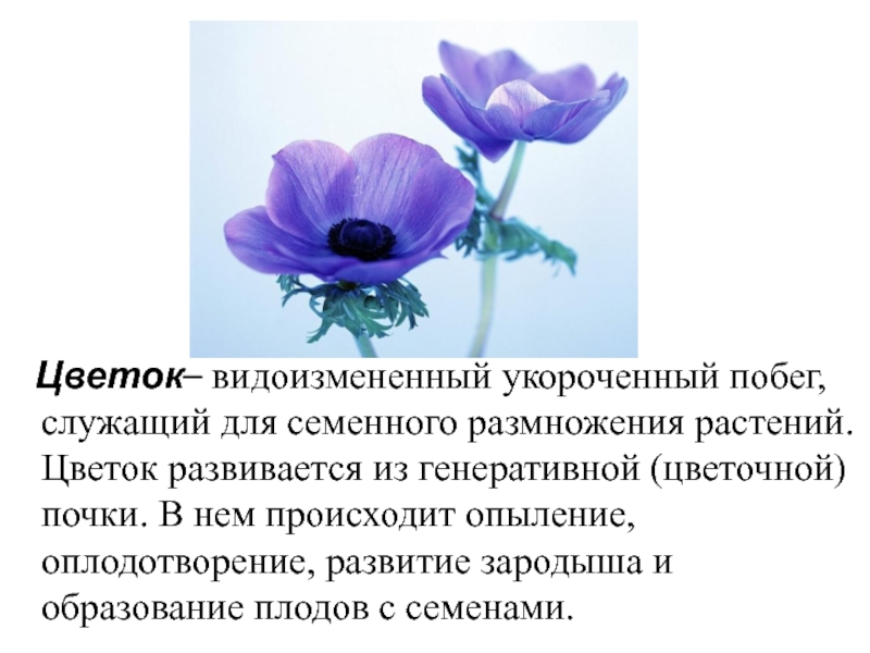 Слайд 4 Цветок– видоизмененный укороченный побег, служащий для семенного размножения растений.