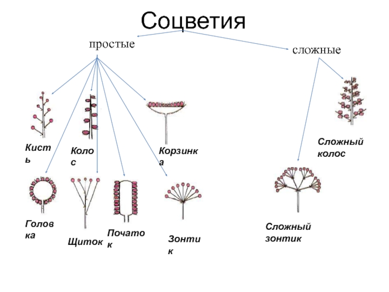 СоцветияСложный колосСложный зонтикЩитокПочатокГоловкаЗонтикКорзинкаКолосКистьпростыесложные