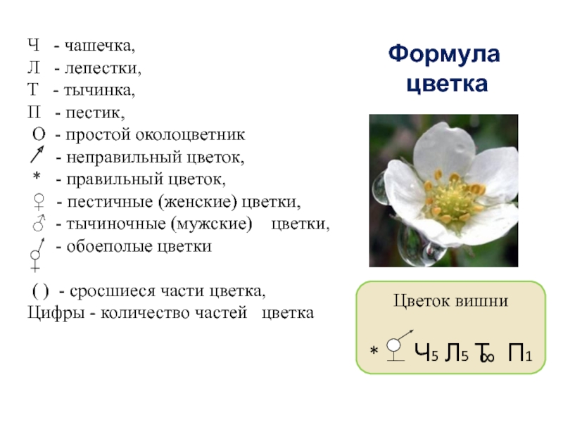 Формула цветка Ч  - чашечка,Л  - лепестки,Т  - тычинка,П  - пестик, О -