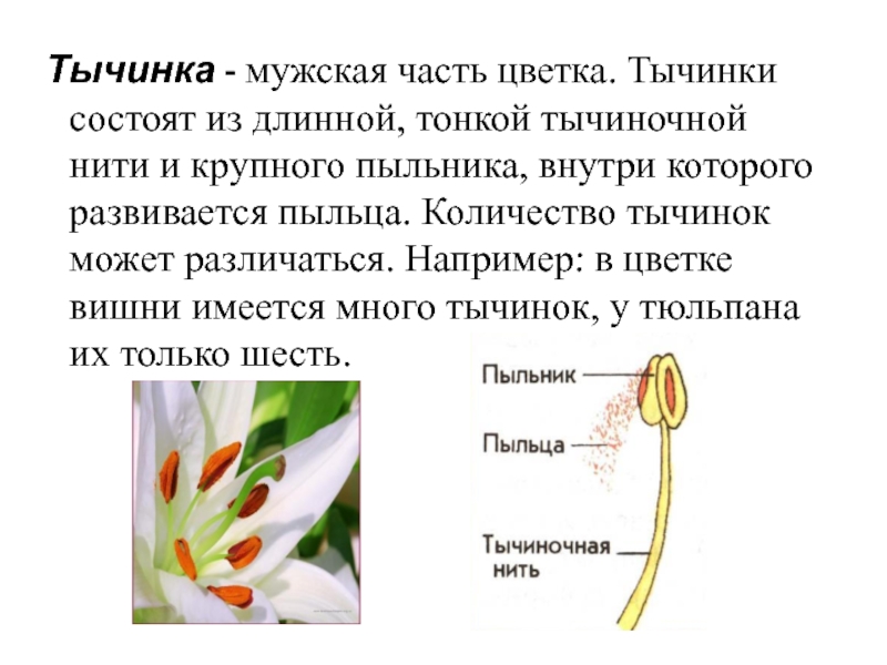 тычиночной нити и крупного пыльника, внутри которого развивается пыльца. Количество тычинок может различаться. Например: в цветке вишни имеется много тычинок, у тюльпана их только шесть.