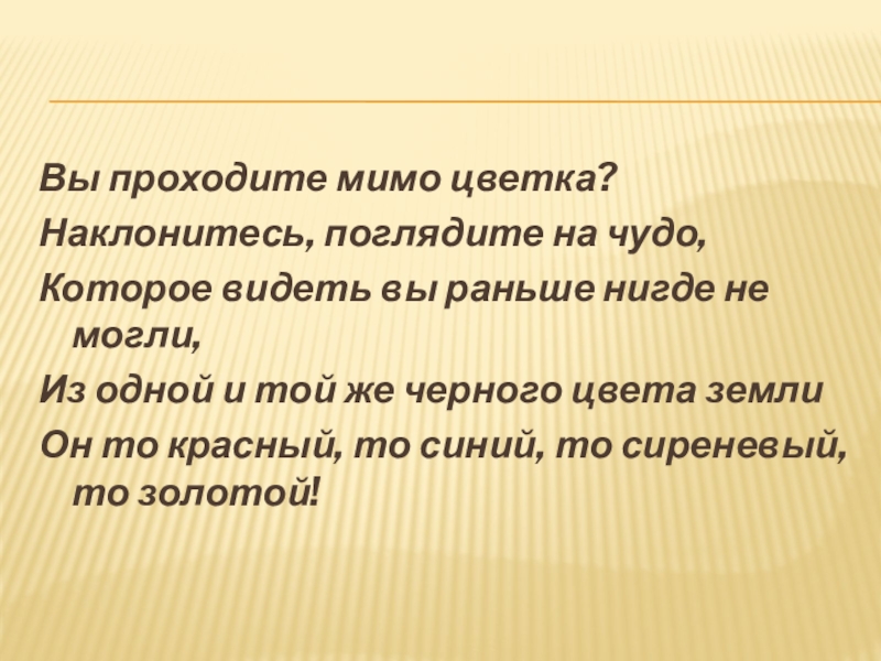 Вы проходите мимо цветка?Наклонитесь, поглядите на чудо,Которое видеть вы раньше нигде не могли,Из одной и той же