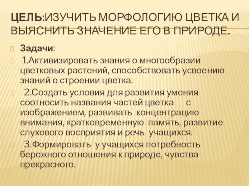 Цель:Изучить морфологию цветка и выяснить значение его в природе.Задачи: 1.Активизировать знания о многообразии цветковых растений, способствовать усвоению