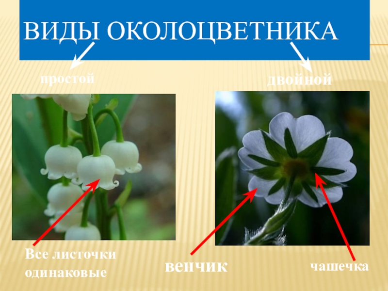 Виды околоцветникапростойдвойнойВсе листочки одинаковыевенчикчашечка
