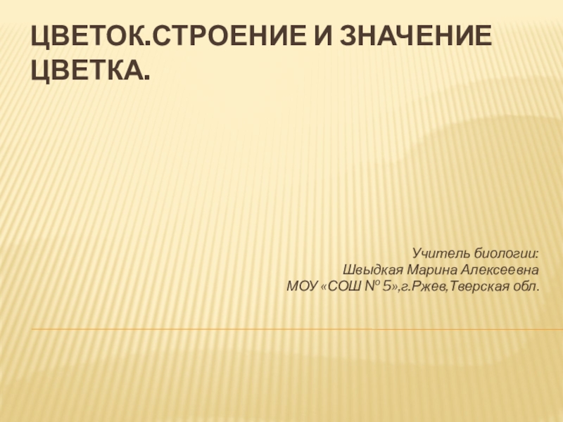 Цветок.Строение и значение цветка.Учитель биологии:Швыдкая Марина АлексеевнаМОУ «СОШ № 5»,г.Ржев,Тверская обл.