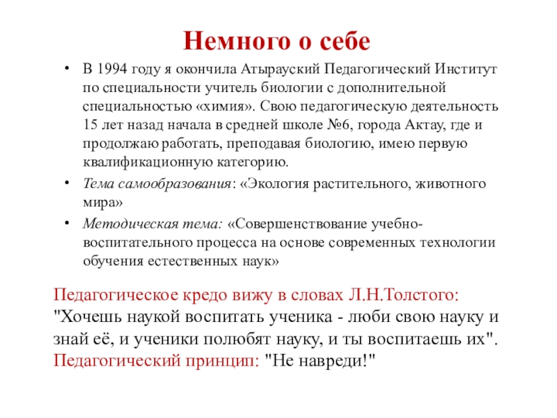 Педагогическое кредо вижу в словах Л.Н.Толстого: "Хочешь наукой воспитать ученика - люби свою науку и знай её, и ученики полюбят науку, и ты воспитаешь их".