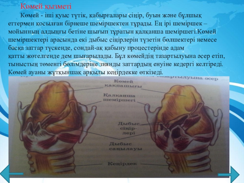 і, Өкпе құрылысы: 1-оң жақ өкпенің төменгі бөлігі, 2-оң жақ өкпенің ортаңғы бөлігі, 3-оң жақ өкпенің жоғарғы бөлігі,4-айыр без, 5-кеңірдек, 6-қалқанша шеміршек, 7-тіл асты сүйегі, 8-көмей сіңірі, 9-жүзік тәрізді желбезек, 10-париетальды өкпеқап, 11-сол жақ өкпенің жоғарғы бөлігі, 12-сол жақ өкпенің төменгі бөлігі, 13-кішкене тіл, 14-жүрек ойығы, 15 - үлпершекпен жабылған жүрек бөлігі