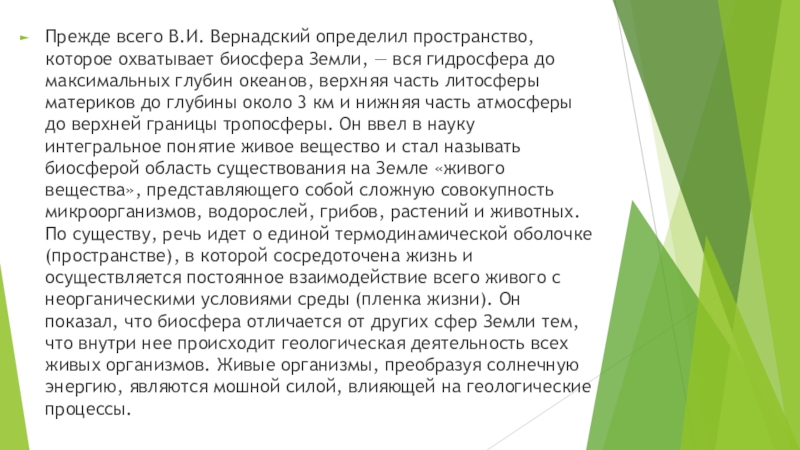 вся гидросфера до максимальных глубин океанов, верхняя часть литосферы материков до глубины около 3 км и нижняя часть атмосферы до верхней границы тропосферы. Он ввел в науку интегральное понятие живое вещество и стал называть биосферой область существования на Земле «живого вещества», представляющего собой сложную совокупность микроорганизмов, водорослей, грибов, растений и животных. По существу, речь идет о единой термодинамической оболочке (пространстве), в которой сосредоточена жизнь и осуществляется постоянное взаимодействие всего живого с неорганическими условиями среды (пленка жизни). Он показал, что биосфера отличается от других сфер Земли тем, что внутри нее происходит геологическая деятельность всех живых организмов. Живые организмы, преобразуя солнечную энергию, являются мошной силой, влияющей на геологические процессы.