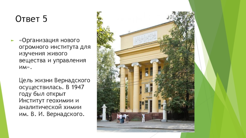 Цель жизни Вернадского осуществилась. В 1947 году был открыт Институт геохимии и аналитической химии им. В. И. Вернадского.