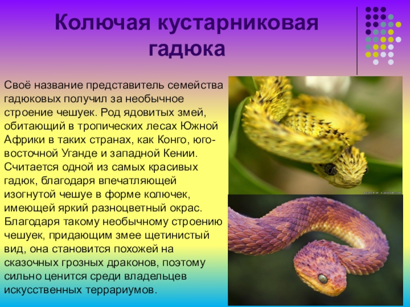 Род ядовитых змей, обитающий в тропических лесах Южной Африки в таких странах, как Конго, юго-восточной Уганде и западной Кении. Считается одной из самых красивых гадюк, благодаря впечатляющей изогнутой чешуе в форме колючек, имеющей яркий разноцветный окрас. Благодаря такому необычному строению чешуек, придающим змее щетинистый вид, она становится похожей на сказочных грозных драконов, поэтому сильно ценится среди владельцев искусственных террариумов.