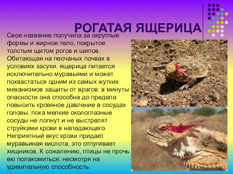 толстым щитом рогов и шипов. Обитающая на песчаных почвах в условиях засухи, ящерица питается исключительно муравьями и может похвастаться одним из самых жутких механизмов защиты от врагов: в минуты опасности она способна до предела повысить кровяное давление в сосудах головы, пока мелкие окологлазные сосуды не лопнут и не выстрелят струйками крови в нападающего. Неприятный вкус крови придает муравьиная кислота, это отпугивает хищников. К сожалению, птицы не прочь ею полакомиться, несмотря на удивительную способность.