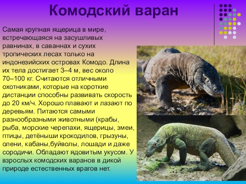 саваннах и сухих тропических лесах только на индонезийских островах Комодо. Длина их тела достигает 3–4 м, вес около 70–100 кг. Считаются отличными охотниками, которые на короткие дистанции способны развивать скорость до 20 км/ч. Хорошо плавают и лазают по деревьям. Питаются самыми разнообразными животными (крабы, рыба, морские черепахи, ящерицы, змеи, птицы, детёныши крокодилов, грызуны, олени, кабаны,буйволы, лошади и даже сородичи. Обладают ядовитым укусом. У взрослых комодских варанов в дикой природе естественных врагов нет.