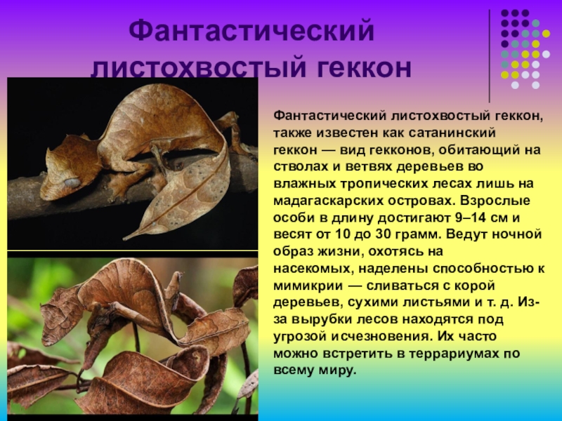гекконов, обитающий на стволах и ветвях деревьев во влажных тропических лесах лишь на мадагаскарских островах. Взрослые особи в длину достигают 9–14 см и весят от 10 до 30 грамм. Ведут ночной образ жизни, охотясь на насекомых, наделены способностью к мимикрии — сливаться с корой деревьев, сухими листьями и т. д. Из-за вырубки лесов находятся под угрозой исчезновения. Их часто можно встретить в террариумах по всему миру.