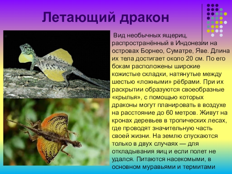 Суматре, Яве. Длина их тела достигает около 20 см. По его бокам расположены широкие кожистые складки, натянутые между шестью «ложными» рёбрами. При их раскрытии образуются своеобразные «крылья», с помощью которых драконы могут планировать в воздухе на расстояние до 60 метров. Живут на кронах деревьев в тропических лесах, где проводят значительную часть своей жизни. На землю спускаются только в двух случаях — для откладывания яиц и если полет не удался. Питаются насекомыми, в основном муравьями и термитами