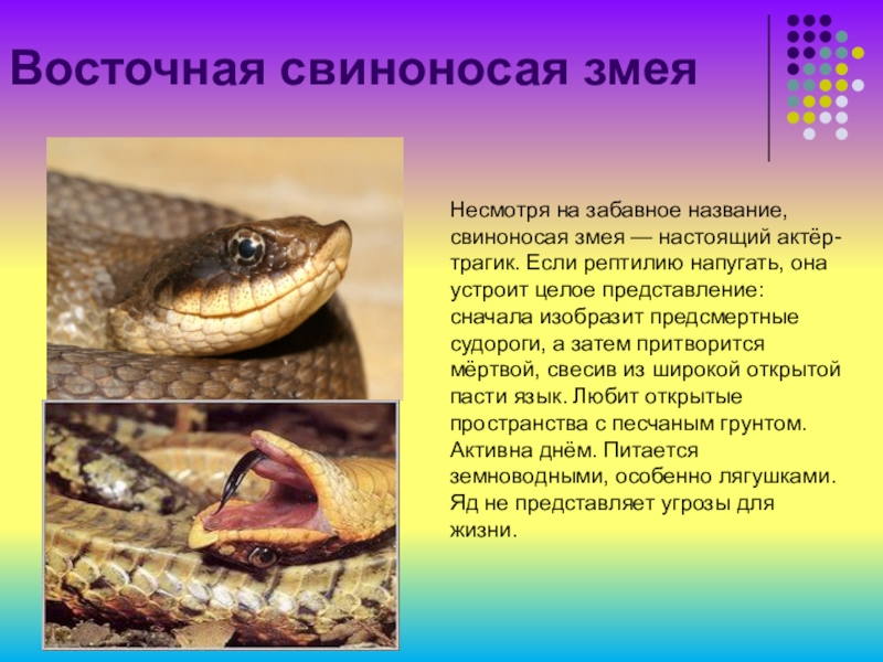 Несмотря на забавное название, свиноносая змея — настоящий актёр-трагик. Если рептилию