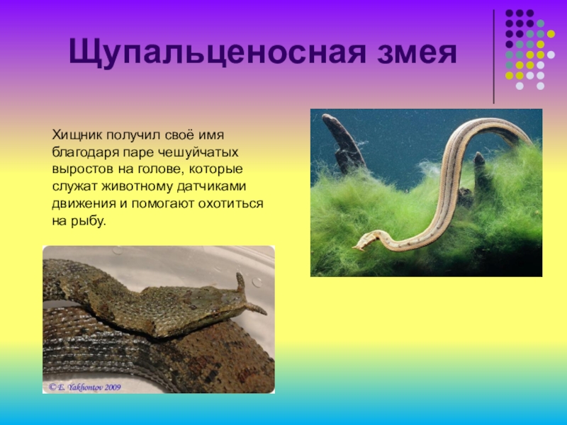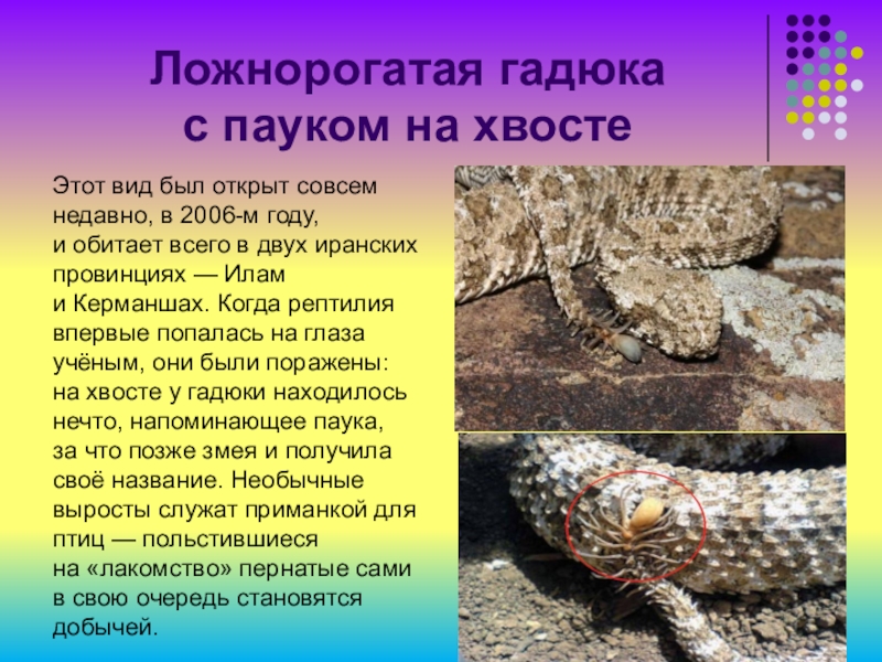 Слайд 17Ложнорогатая гадюка с пауком на хвосте
