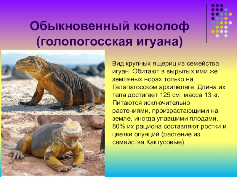 ими же земляных норах только на Галапагосском архипелаге. Длина их тела достигает 125 см, масса 13 кг. Питаются исключительно растениями, произрастающими на земле, иногда упавшими плодами. 80% их рациона составляют ростки и цветки опунций (растение из семейства Кактусовые).