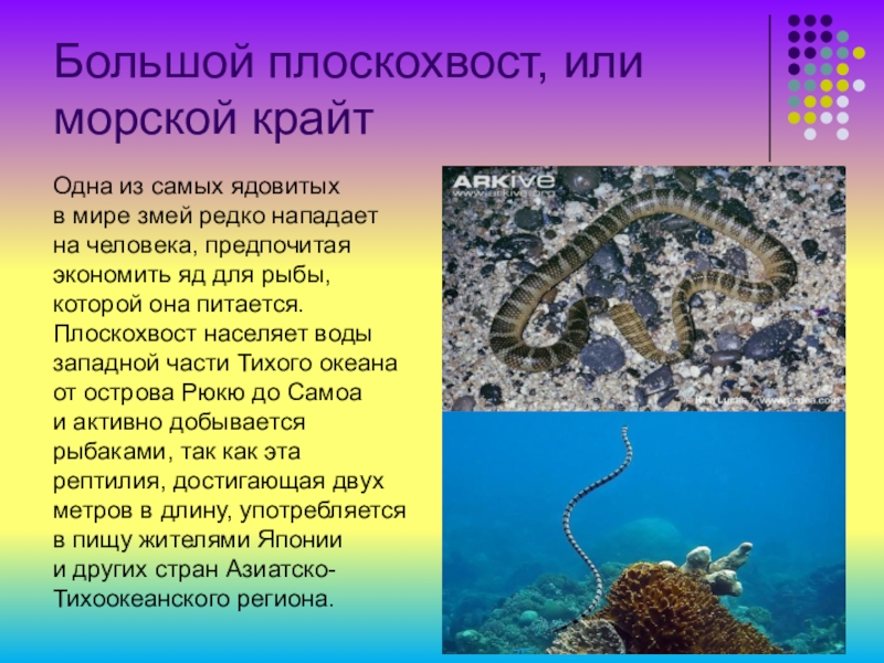 на человека, предпочитая экономить яд для рыбы, которой она питается. Плоскохвост населяет воды западной части Тихого океана от острова Рюкю до Самоа и активно добывается рыбаками, так как эта рептилия, достигающая двух метров в длину, употребляется в пищу жителями Японии и других стран Азиатско-Тихоокеанского региона.