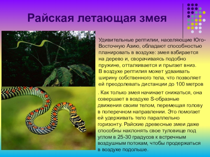 . Как только змея начинает снижаться, она совершает в воздухе S-образные движения своим телом, перемещая голову в поперечном направлении. Это помогает ей удерживать тело параллельно горизонту. Райские древесные змеи даже способны наклонять свое туловище под углом в 25-30 градусов к встречным воздушным потокам, чтобы продержаться в воздухе подольше.