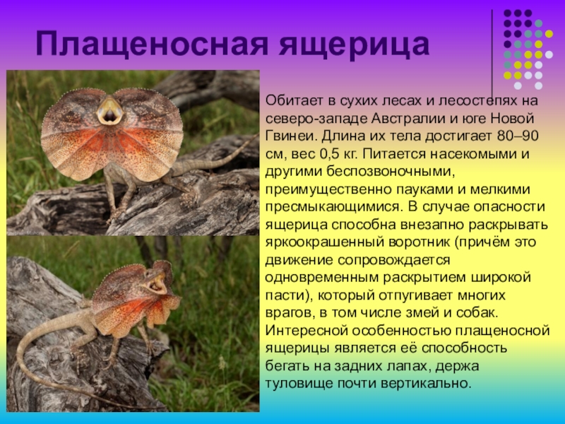 юге Новой Гвинеи. Длина их тела достигает 80–90 см, вес 0,5 кг. Питается насекомыми и другими беспозвоночными, преимущественно пауками и мелкими пресмыкающимися. В случае опасности ящерица способна внезапно раскрывать яркоокрашенный воротник (причём это движение сопровождается одновременным раскрытием широкой пасти), который отпугивает многих врагов, в том числе змей и собак. Интересной особенностью плащеносной ящерицы является её способность бегать на задних лапах, держа туловище почти вертикально.