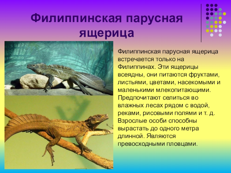 Филиппинская парусная ящерица встречается только на Филиппинах. Эти ящерицы