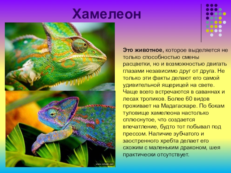 двигать глазами независимо друг от друга. Не только эти факты делают его самой удивительной ящерицей на свете. Чаще всего встречаются в саваннах и лесах тропиков. Более 60 видов проживает на Мадагаскаре. По бокам туловище хамелеона настолько сплюснутое, что создается впечатление, будто тот побывал под прессом. Наличие зубчатого и заостренного хребта делает его схожим с маленьким драконом, шея практически отсутствует.