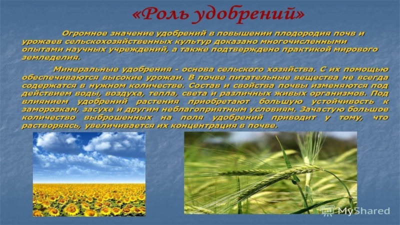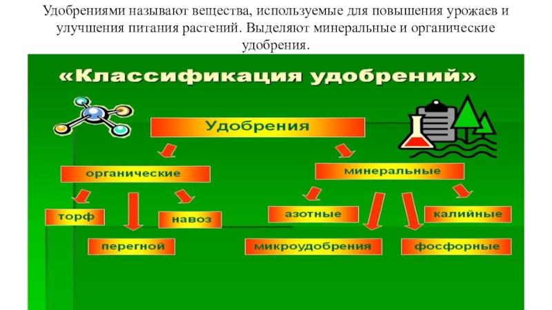 Удобрениями называют вещества, используемые для повышения урожаев и улучшения питания растений. Выделяют минеральные и органические удобрения.