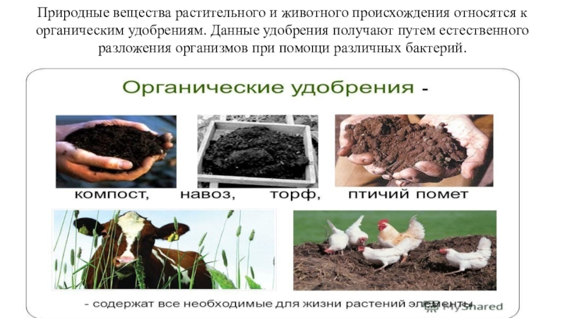 Слайд 6Природные вещества растительного и животного происхождения относятся к органическим удобрениям. Данные
