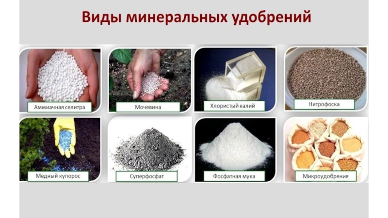 Выделяют минеральные и органические удобрения.
