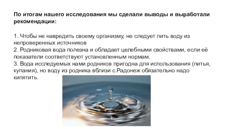 3. Вода исследуемых нами родников пригодна для использования (питья, купания), но воду из родника вблизи с.Радонеж обязательно надо кипятить.