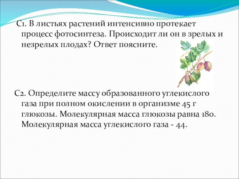 Слайд 19 С1. В листьях растений интенсивно протекает процесс фотосинтеза. Происходит ли