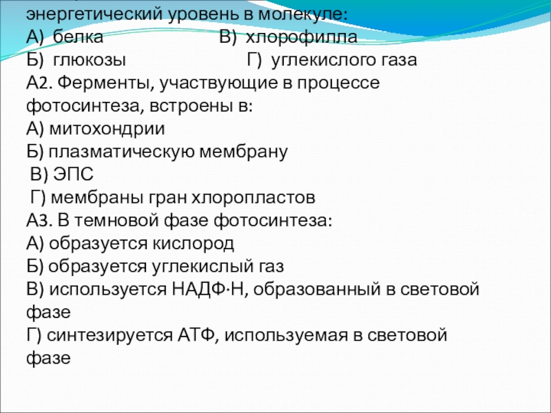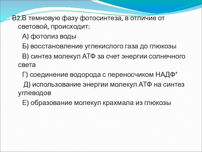 Слайд 16В2.В темновую фазу фотосинтеза, в отличие от световой, происходит: