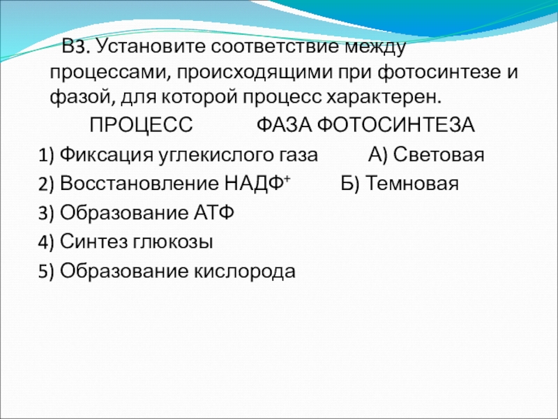 Слайд 17 В3. Установите соответствие между процессами, происходящими при фотосинтезе и фазой, для