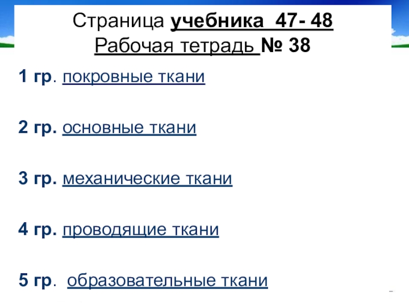 Покровные, образовательные, основные, механические, проводящие.