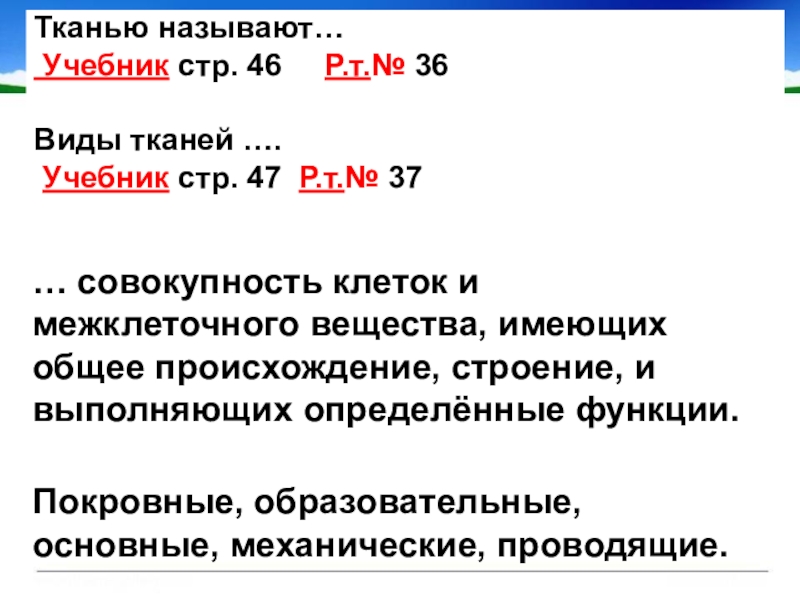 … совокупность клеток и межклеточного вещества, имеющих общее происхождение, строение, и выполняющих определённые функции.