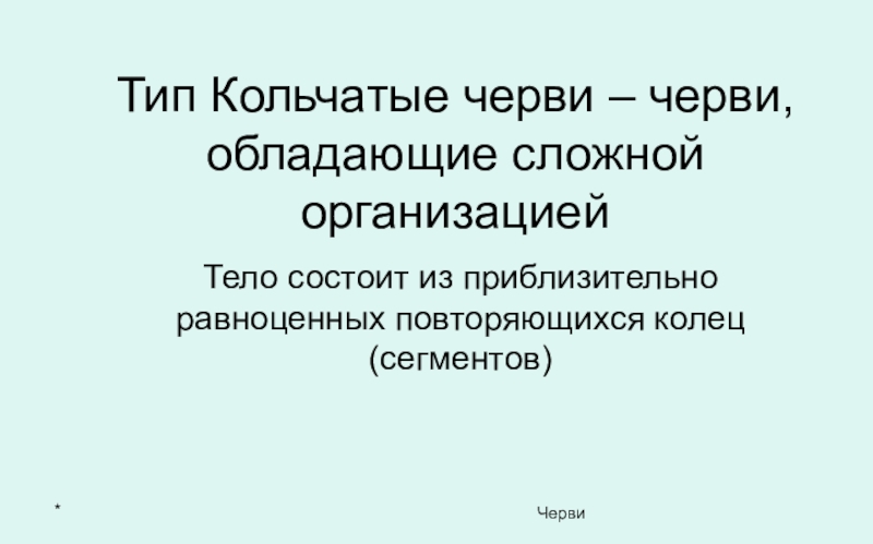 *ЧервиТело состоит из приблизительно равноценных повторяющихся колец (сегментов)Тип Кольчатые черви – черви, обладающие сложной организацией