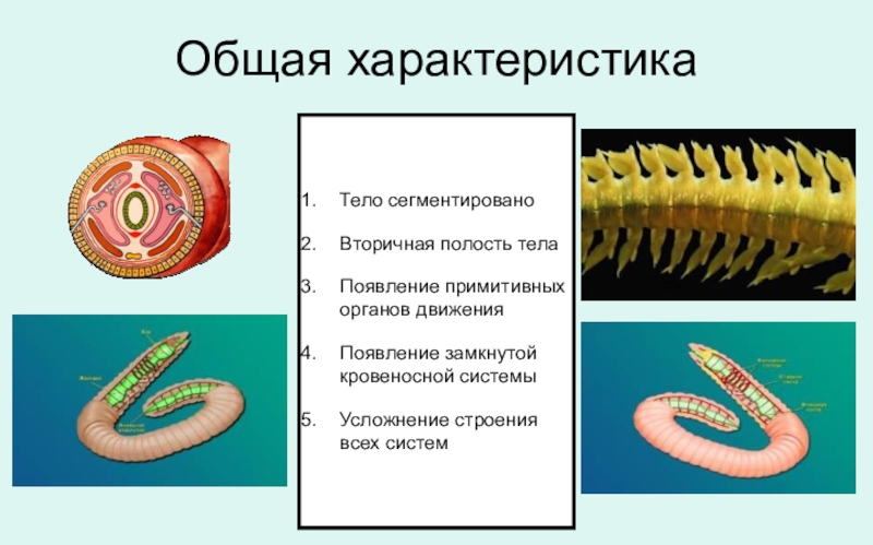 Общая характеристикаТело сегментированоВторичная полость телаПоявление примитивных органов движения Появление замкнутой кровеносной системыУсложнение строения всех систем