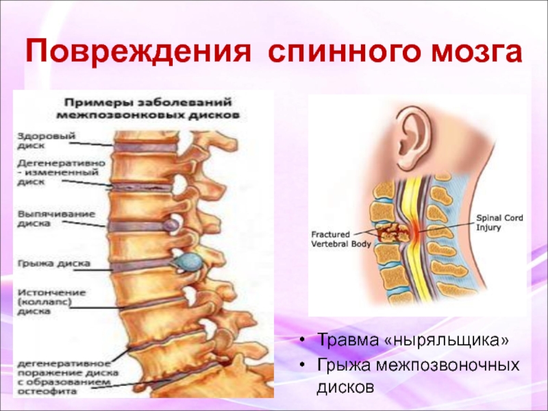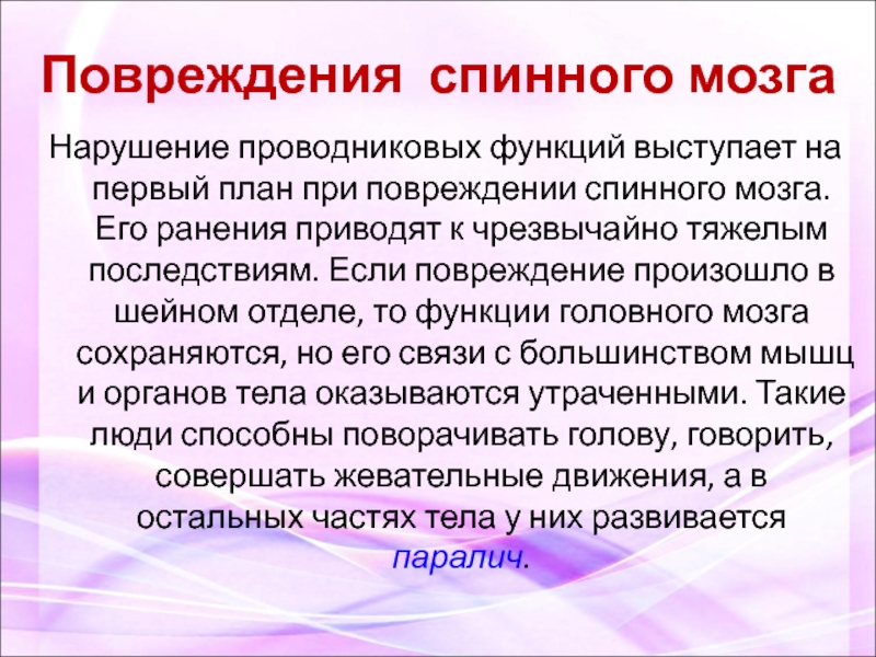 спинного мозга. Его ранения приводят к чрезвычайно тяжелым последствиям. Если повреждение произошло в шейном отделе, то функции головного мозга сохраняются, но его связи с большинством мышц и органов тела оказываются утраченными. Такие люди способны поворачивать голову, говорить, совершать жевательные движения, а в остальных частях тела у них развивается паралич.