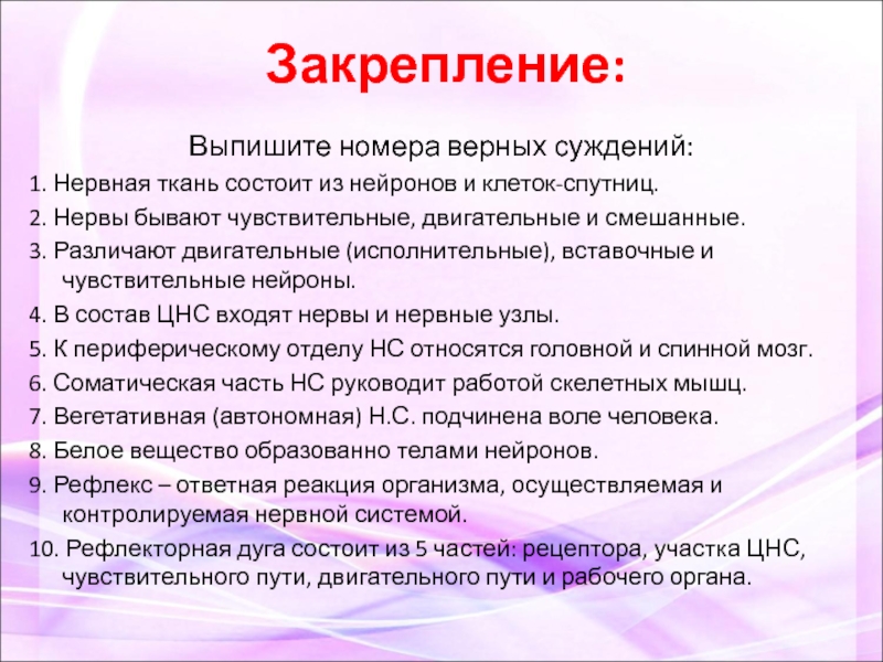 1. Нервная ткань состоит из нейронов и клеток-спутниц.
