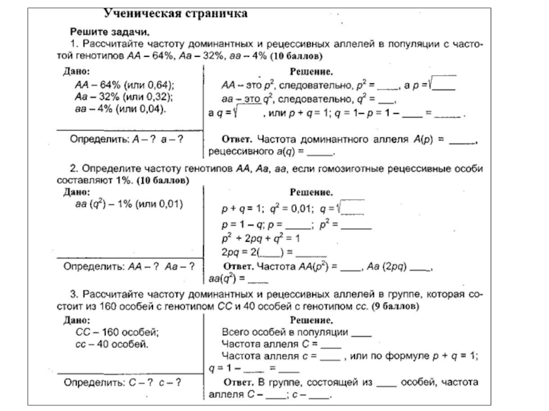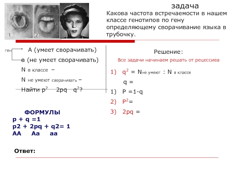 Р = 1 – q = 1 – 0,26 = 0,74 (частота аллеля А)
