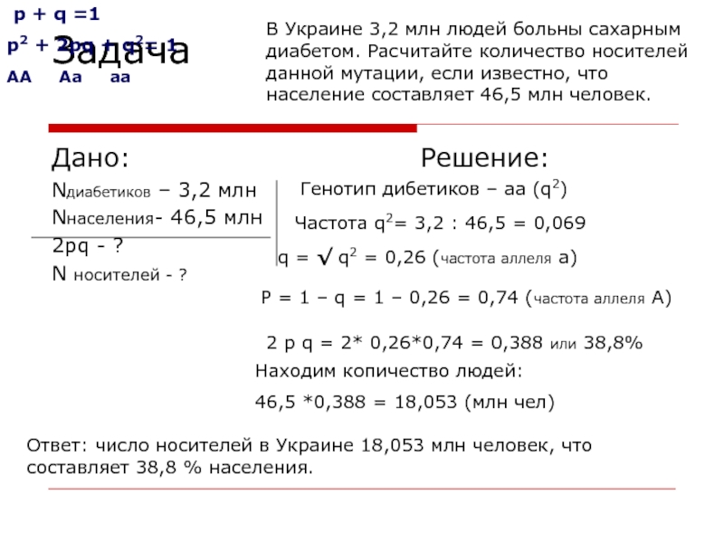 В Украине 3,2 млн людей больны сахарным диабетом. Расчитайте количество носителей данной мутации, если известно, что население составляет 46,5 млн человек.